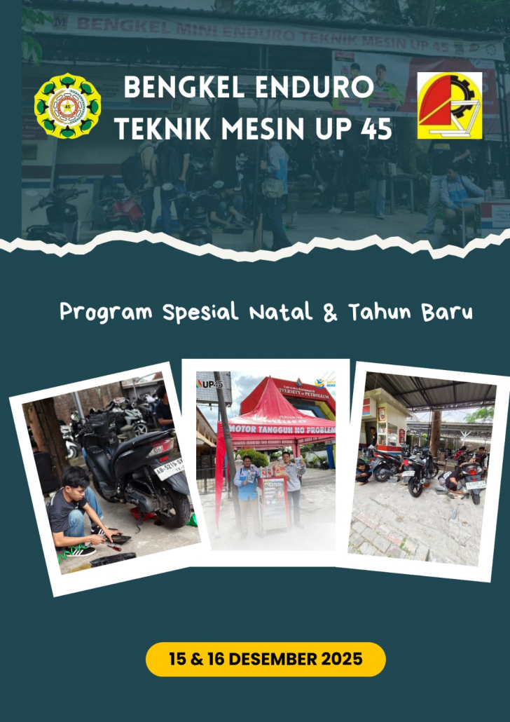 Himpunan Mahasiswa Teknik Mesin (HMTM) Universitas Proklamasi 45 Yogyakarta kembali menjalin kerja sama dengan Pertamina Lubricants dengan mengadakan promo ganti Oli Enduro dalam rangka menyambut Natal dan Tahun Baru. Kegiatan ini akan dilaksanakan selama dua hari, pada Senin–Selasa, 15–16 Desember 2025, bertempat di Universitas Proklamasi 45 Yogyakarta, mulai pukul 08.00 hingga 17.00 WIB.